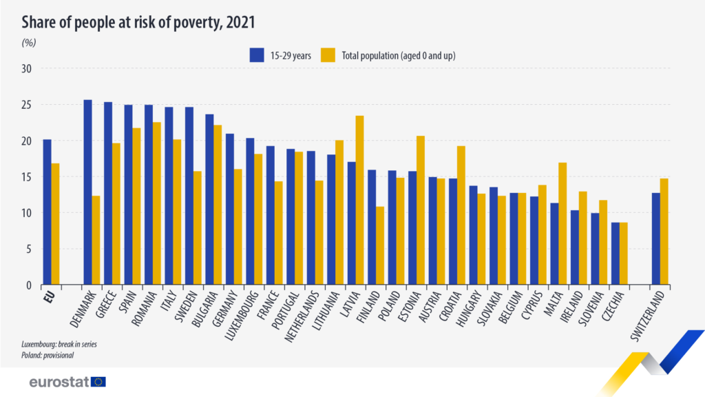 Acest lucru s-a întâmplat în 19 de țări ale UE, cea mai mare diferență dintre cele două fiind observată în Danemarca (12,3% din populația totală expusă riscului de sărăcie, comparativ cu 25,6% din tineri) și Suedia (15,7% față de 24,6%).