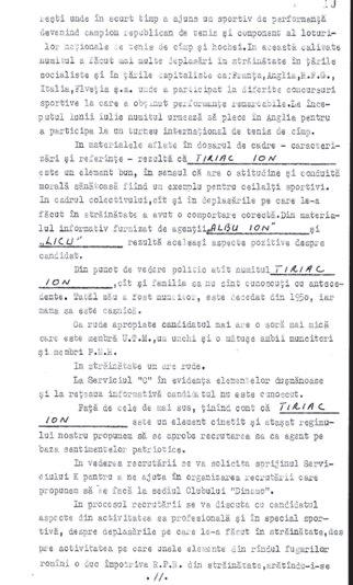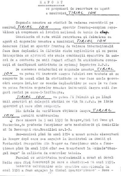 „Subsemnatul Țiriac Ion născut la 9 mai 1939, în Brașov, fiul lui Ion și al Ecaterinei, cu domiciliul în București, Str. Doamnei nr. 5, față de organele de securitate îmi iau următorul angajament: