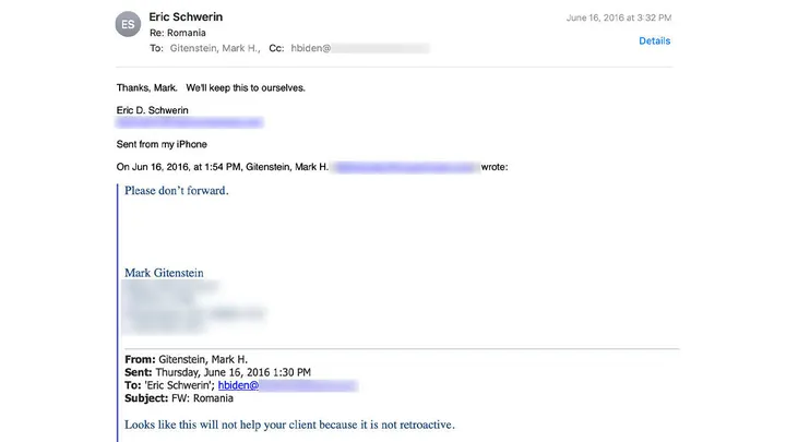 „Se pare că acest lucru nu vă va ajuta clientul, deoarece nu este retroactiv”, a scris Gitenstein pe 16 iunie 2016, într-un e-mail către Hunter Biden și Eric Schwerin.