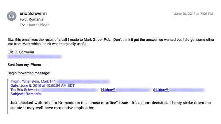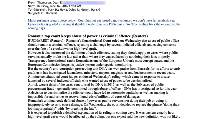 E-mailul a inclus un articol al Associated Press care spunea că era previzibilă reacția Curții Constituționale a României cu privire la decriminalizarea abuzului în serviciu. Instanța a pronunțat o hotărâre împotriva mișcării și a menținut-o ca infracțiune, dar asociații lui Hunter s-au gândit dacă asta l-ar putea ajuta pe unul dintre clienții lui Hunter.