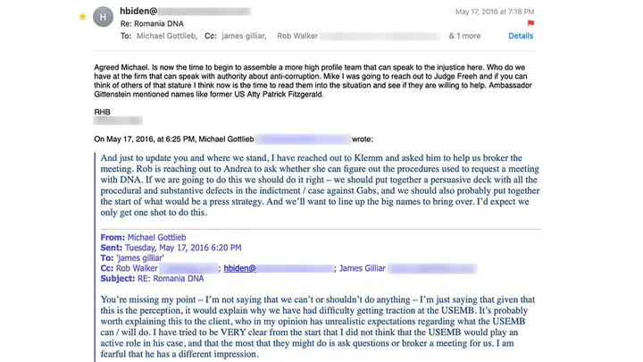 “Acum este momentul să începeți să formați o echipă cu profil mai înalt, care poate vorbi despre nedreptatea de aici”, a scris Hunter către avocații de la Boies Schiller, Michael Gottlieb, Rob Walker, și James Gilliar pe 16 mai 2016. „Pe oricine avem la firmă care poate vorbi cu autoritate despre anticorupție. Mike, urma să mă adresez judecătorului Freeh și dacă vă puteți gândi la alții de acest nivel cred că acum este momentul să îi puneți la curent despre situație și să vedeți dacă ei sunt dispuși să ajute.”