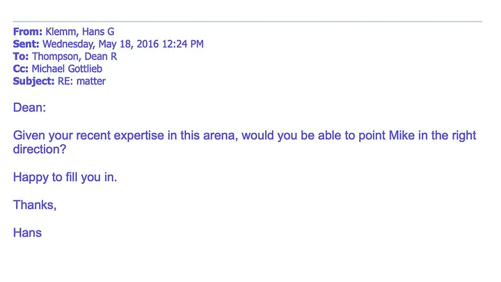 În comunicările precedente din lanțul de e-mai-uri cu Hunter, Gottlieb și-a exprimat frustrările cu privire la „dificultatea de a face progrese” cu Ambasada SUA pentru a-l ajuta pe clientul lui Hunter. Cu toate acestea, el a spus că „l-a contactat pe Klemm și i-a cerut să îi ajute să intermedieze întâlnirea”.
