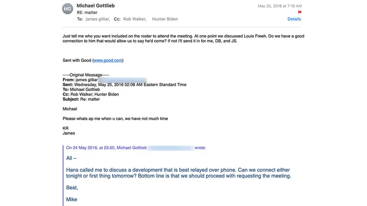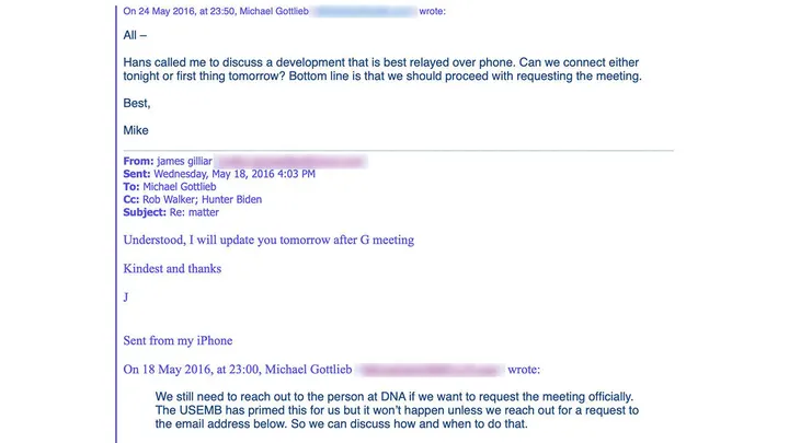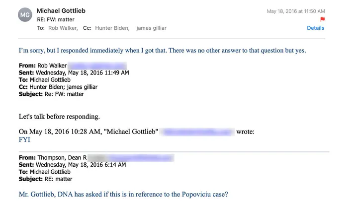 Gottlieb a trimis apoi e-mailul lui Thompson către Hunter, prietenul și partenerul de afaceri al lui Hunter, Rob Walker, și James Gilliar, un alt asociat de afaceri. Mesajul lui Gottlieb a fost doar „FYI”.