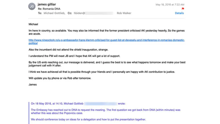 În aceeași zi, pe 18 mai 2016, Gilliar le-a trimis un e-mail lui Gottlieb, Hunter și Walker, spunând că fostul președinte al României, Traian Băsescu, îl critica „la greu” pe Klemm pentru presupusa ingerință politică.