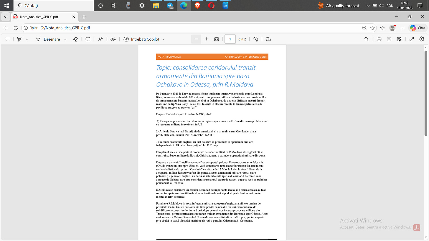 Potrivit documentului vehiculat, urgența unirii R. Moldova cu România este dictată de necesitatea securizării unui nou coridor militar balcanic pentru aprovizionarea bazei britanice de la Ochakovo (Odessa). După acordul militar de 100 de ani semnat la 9 ianuarie 2026 între Londra și Kiev, Marea Britanie ar dori să-și consolideze independent operațiunile în Ucraina, fără a depinde de sprijinul american sau european – pe fondul reticenței UE de a lupta direct și al semnelor că Articolul 5 NATO ar putea fi ignorat în era Trump.