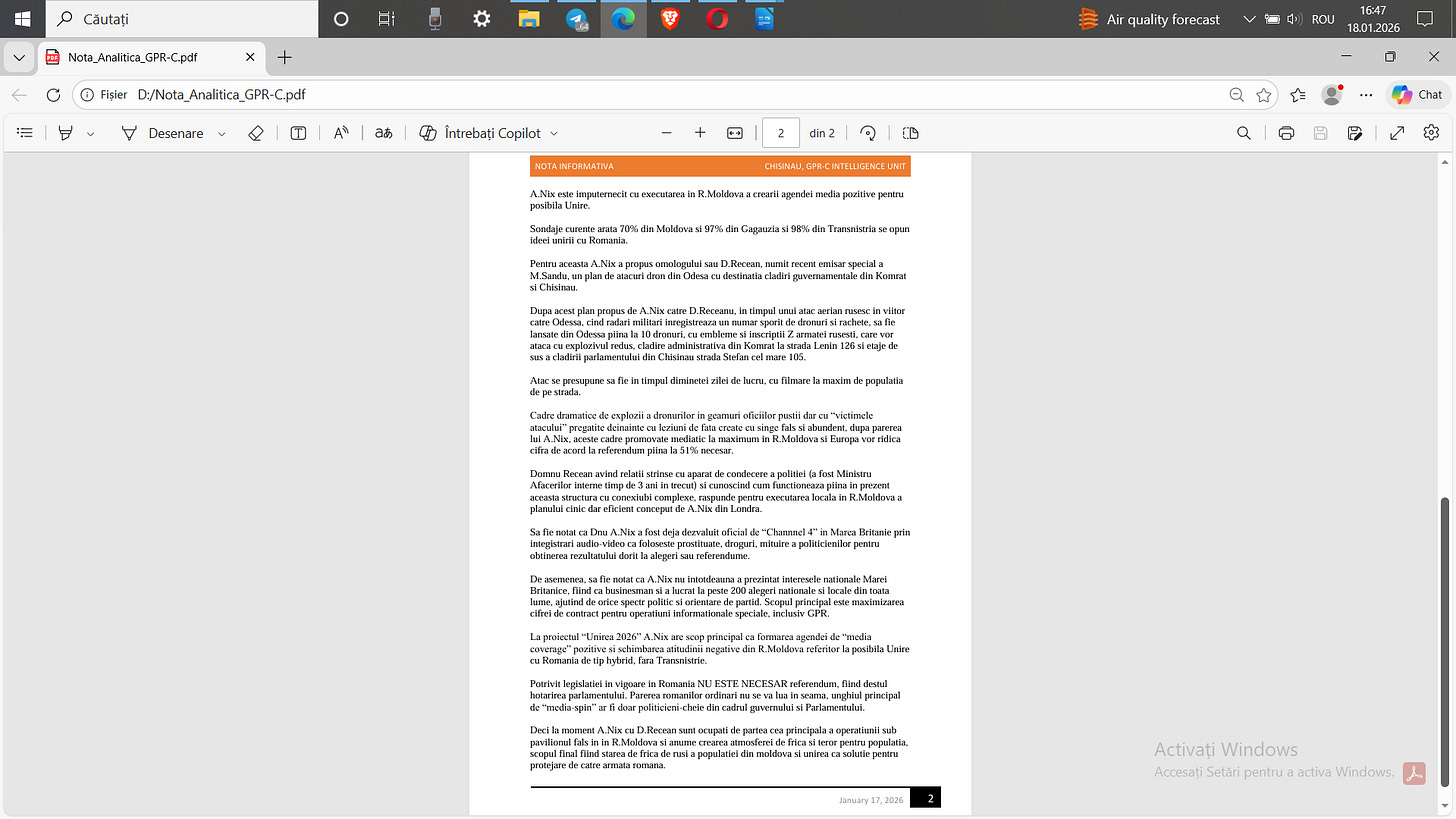 O presupusă notă informativă a Serviciului de Informații și Securitate al Republicii Moldova, publicată de fostul deputat român Cristian Rizea, susține că Marea Britanie pregătește o operațiune complexă de manipulare mediatică și atentate simulate pentru a accelera unirea R. Moldova cu România în 2026, profitând de contextul războiului din Ucraina.