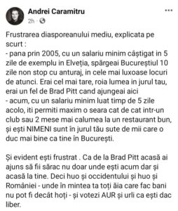 Are însă fracturi mari de logică pentru că diferența de valoare financiară nu e din vina bietului diasporean ( el nu câștigă mai puțin din munca lui) dar totul a ajuns să fie în România mult mai scump. Dacă o zi muncită în Germania acum zece ani îți ajungea să trăiești în România 5-6 zile astăzi rămâi fără bani în maxim două zile dar asta nu e în nici un caz imputabil diasporeanului. Și mai face o greșeala de logică. Milioanele de români plecați în Diaspora nu au plecat să facă bani ca să se dea “jmekeri” în România, au plecat că să poată avea ei și familiile lor un trai mai bun. Dacă ajung să și cheltuie bani in România asta e o rezultantă, nu un scop în sine. Și ar fi bine ca Andrei Caramitru să se bucure că românii din Diaspora cheltuie din banii câștigați în Diaspora în România ( sau trimit bani în țară, 5+5=10mld. € doar anul trecut, 5% din PIB) pt că altfel economia României s-ar fi prăbușit demult.