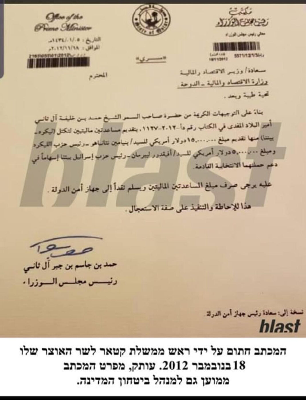 Pe fondul războiului israelo-palestinian a fost scurs acest document ce stipulează următoarele (traducere aproximativă): “În 2012 au fost executate din partea guvernului Qatar, cu aprobarea premierului și a ministrului de finanțe, două plăți cu bani cash în valoare de 15 milioane de dolari, respectiv 5 milioane de dolari, către doi lideri politici din Israel, spre a le servi în campania electorală. Serviciile secrete quatareze au ridicat sumele cash de la Banca Națională a Qatarului, apoi le-au livrat lui Bibi Netanyahu (15 mil $) și Avigdor Lieberman (5 mil $).”