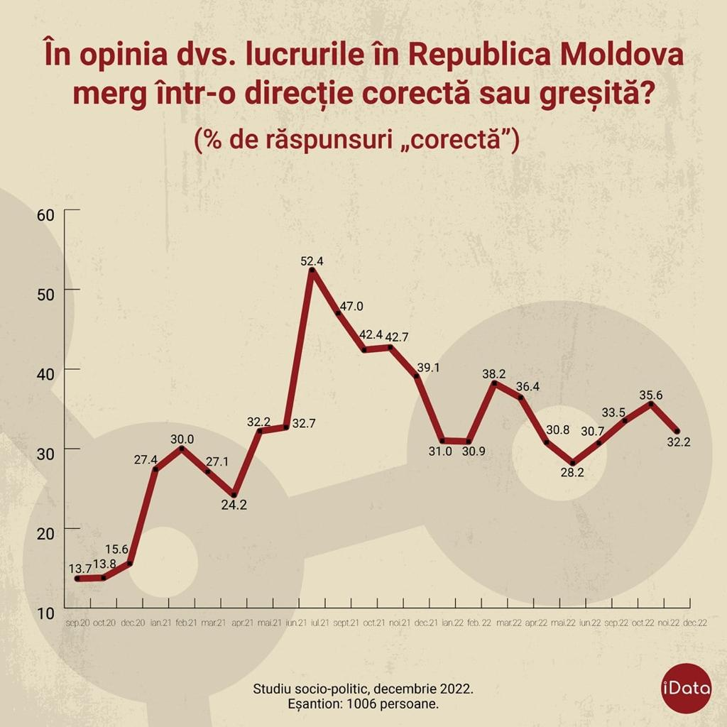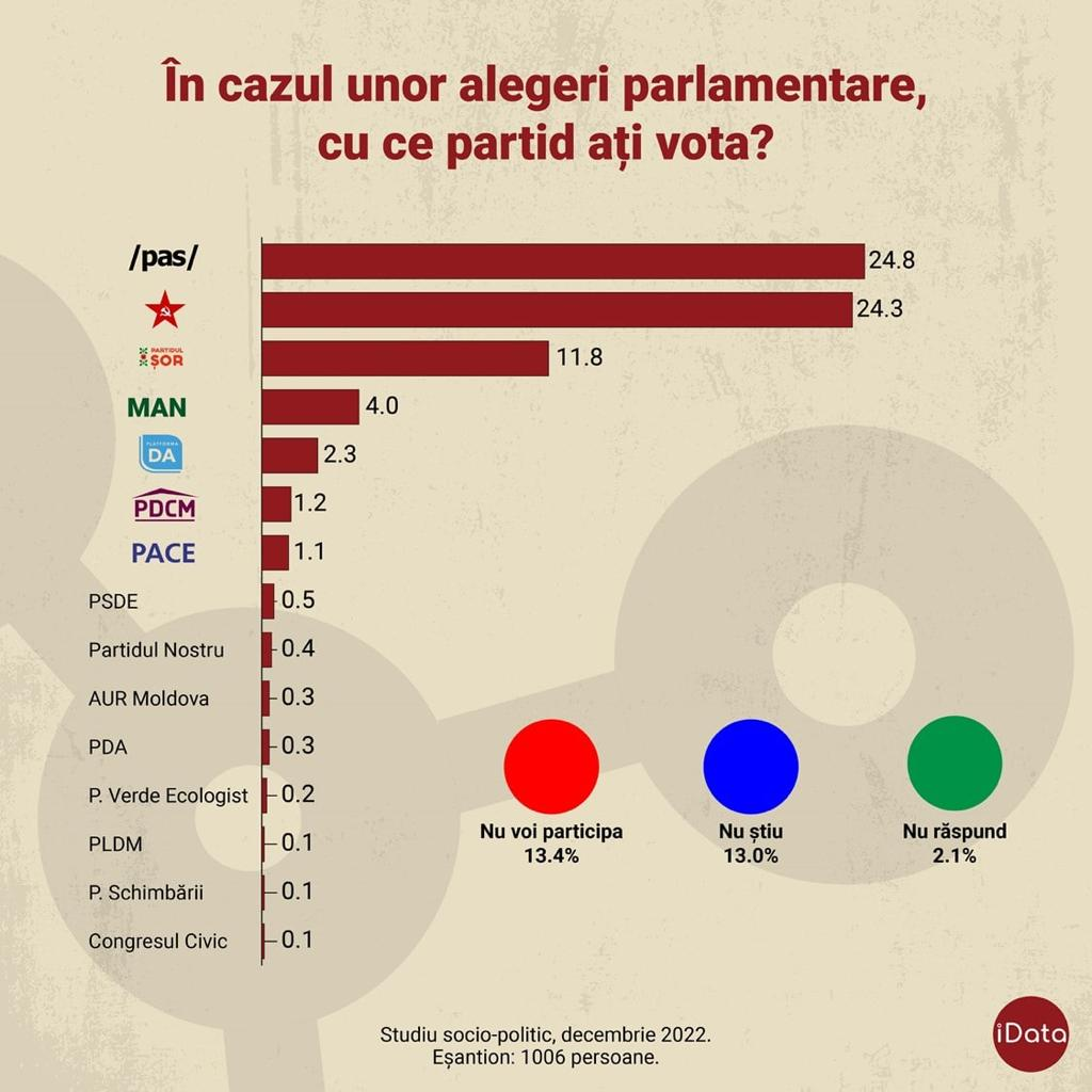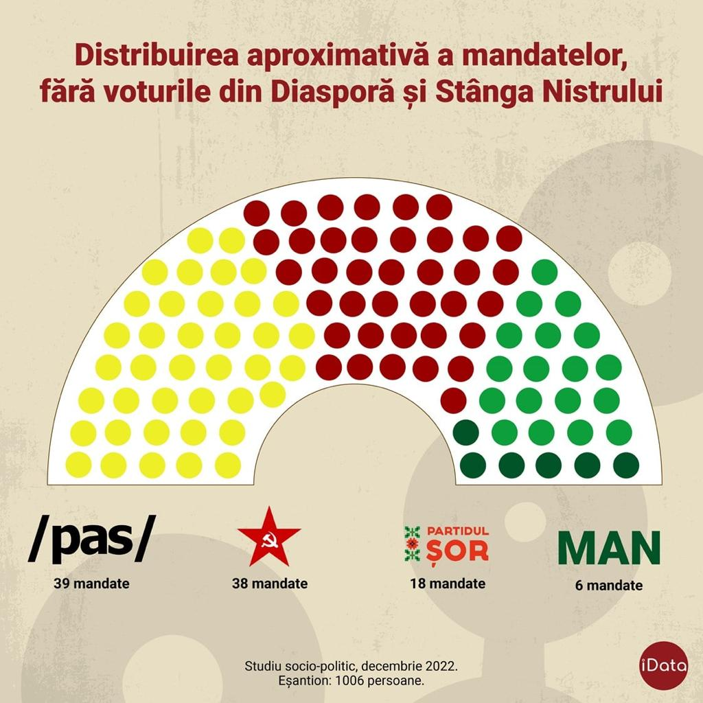 Conform datelor ultimei cercetări de piață, la finele acestui an, situația politică în Republica Moldova este cea pe care o prezentăm mai jos. Fără alte comentarii. Cu excepția precizării că „frații noștri de peste Prut” se îndepărtează tot mai mult și de România, și de Uniunea Europeană.