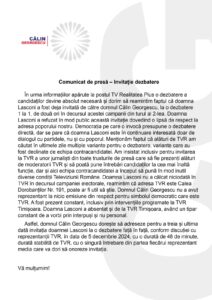 “In urma informatiilor aparute la postul TV Realitatea Plus o debatere a candidatilor devine absolut necesara si dorim sã reamintim faptul cã doamna Lasconi a fost deja invitat de către domnul Călin Georgescu, la o dezbatere 1 la 1, de doua ori in decursul acestei campanii din turul al 2-lea. Doamna Lasconi a refuzat in mod public aceast invitatie dovedind o lipsã de respect la adresa poporului nostru. Democratia pe care o invoca presupune o debatere directa, dar se pare ca doamna Lasconi este in continuare interesata doar de dialogul cu partidele, nu si cu poporul.