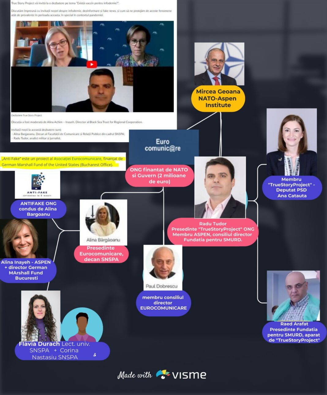 Radu Tudor – membru în Aspen Institute, fondat de Mircea Geoană, actual secretar general adjunct al NATO. NATO finanțează două dintre aceste ONG-uri, EuroComunicare și AntiFake pentru a combate “dezinformările” în modul tendențios si calomnios, pe care l-am descris mai sus. Aspen Dialogues al Aspen Institute finanteaza ONG-ul lui Radu Tudor, TrueStoryProject tot pentru acelasi “scop”.