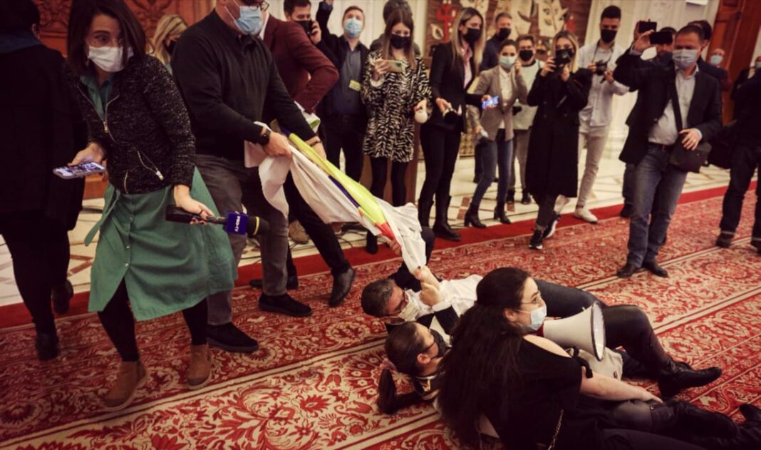 Trei reprezentanţi ai unor asociaţii civice au protestat, joi, pe holurile Palatului Parlamentului, în timp ce deputaţii şi senatorii îşi exprimau votul asupra Guvernului propus de premierul desemnat Nicolae Ciucă, afişând un banner pe care era expus mesajul: “Tot voi?”.