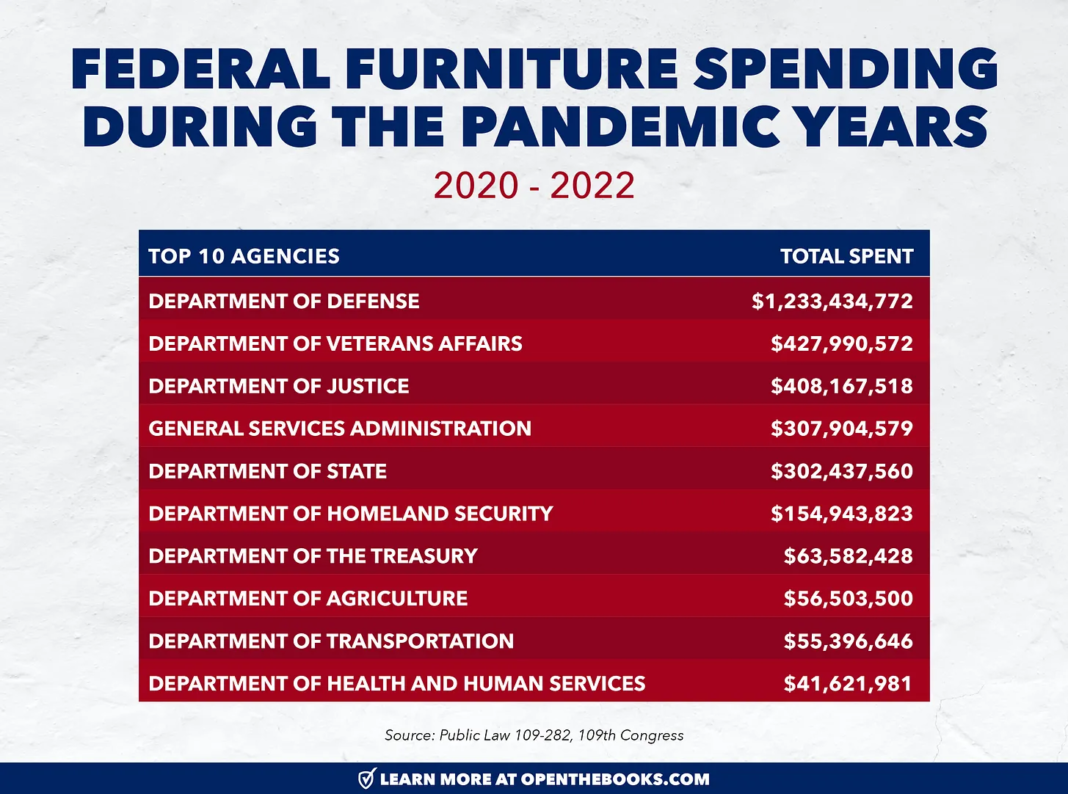 De exemplu, în 2021, la apogeul pandemiei, Centrele pentru Controlul și Prevenirea Bolilor au cheltuit 237.960 de dolari pe mese de picnic alimentate cu energie solară. Ne întrebăm dacă au inclus o aplicație de distanțare socială. Departamentul de Stat a cheltuit aproape 120.000 de dolari pe noi scaune de piele Ethan Allen pentru ambasada sa în Islamabad.