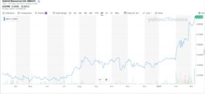 - Din 1 februarie 2024, prețul acțiunii urcă abrupt până la 0,87 dolari canadieni/acțiune, adică se dublează într-o singură lună;