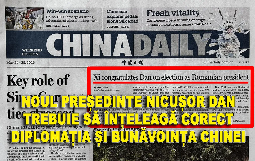 A surprins în mod deosebit mesajul oficial transmis la data de 23 Mai 2025, apărut în toată presa din China, inclusiv pe agenția de de presă Xinhua, la principalele jurnale de știri, în cele 76 de limbi ale China Media Group (CMG), dar și în deschiderea numărului tipărit din data de 24 Mai 2025 al CHINA DAILY, care titra în deschiderea primei pagini: “Xi îl felicită pe Dan pentru alegerea în funcția de președinte al României”.