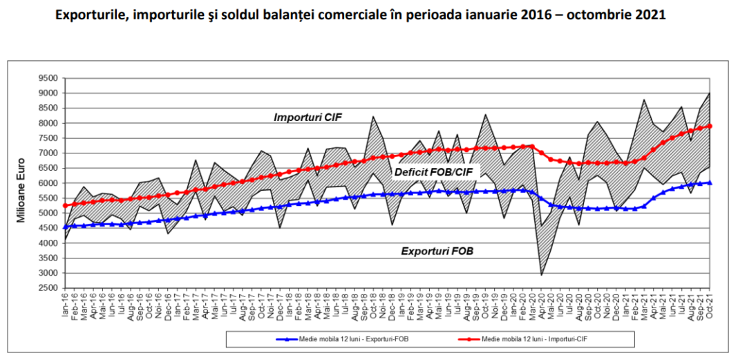 În primele zece luni ale anului, exporturile au crescut cu 19,6% față de perioada similară din 2020 și au ajuns la 61,07 de miliarde de euro. În schimb, importurile s-au majorat cu 21,8% până la 80,28 de miliarde de euro. A rezultat un deficit de 19,20 de miliarde, mai mare cu 4,34 miliarde față de primele nouă luni ale anului trecut.