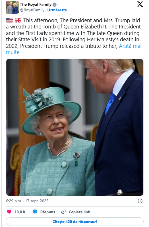 ACTUALIZARE 18.07 Donald Trump și soția sa, Melania, au depus o coroană de flori pe mormântul reginei Elisabeta a II-a, într-un moment privat, în capela Sfântul Gheorghe din Windsor. Președintele, care este un mare admirator al familiei regale, o respecta în mod deosebit pe regretata regină.