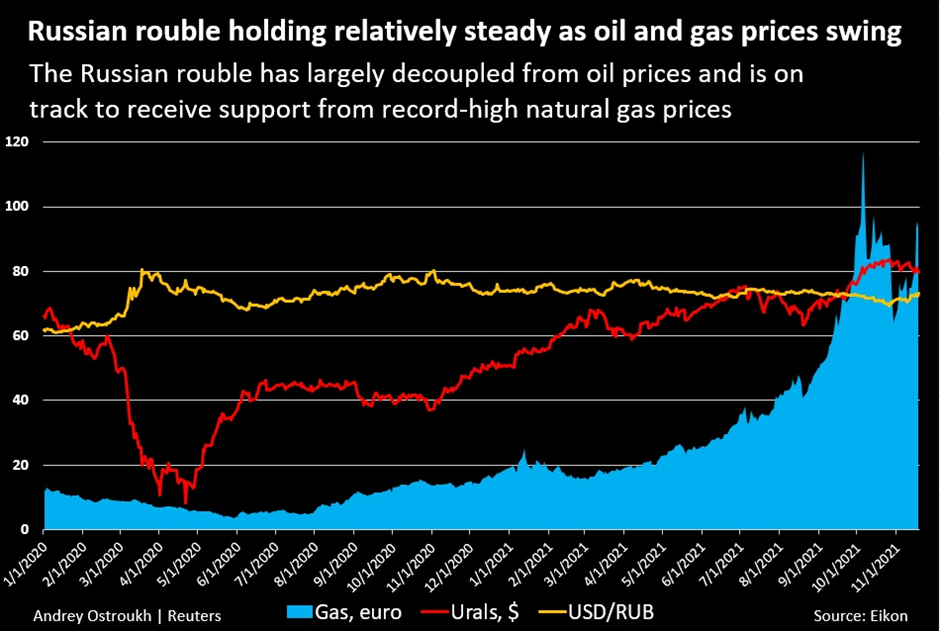 Creșterea prețurilor la gaz natural și petrol le-a adus rușilor un an economic 2021 mult mai bun decât se așteptau. Și asta pentru că 36% (mai mult de o treime) din veniturile bugetare ale Federației vin din vânzarea hidrocarburilor. 119 miliarde de dolari (9 100 miliarde de ruble) a primit bugetul federal de pe urma gazului și a țițeiului, cu 51% mai mult decât se anticipa la începutul anului. Iar totalul veniturilor bugetare a urcat de la 18 700 de miliarde de ruble în 2020 la 25 290 miliarde de ruble în 2021.