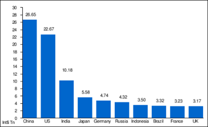 Mai mult, dacă ne dăm doi pași în spate, iată ce tablou vedem: economia celei de-a doua mari puteri miliatre a lumii este ceva mai mică decât cea germană, care înseamnă cam un sfert din economia întregii Uniuni Europene. Sau mai mare cu o treime decât cea a Franței. Ca valoare nominală, Rusia este a 11-a cea mai mare economie a lumii, cu un PIB de 1700 de miliarde de dolari (2021). În prețuri comparabile, însă, Rusia este a șasea cea mai mare economie a planetei, cu 4 320 miliarde de dolari (metodologia PPP). Este, așadar, economia rusă de cinci ori mai mică decât cea a marilor rivali americani. Hai să privim o imagine sugestivă, cea care indică cele mai mari 10 economii ale lumii, în prețuri comparabile: