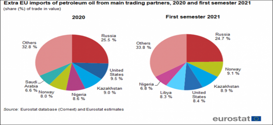 Important, dar nu în asemenea măsură ca în cazul gazului este și locul de principal furnizor de țiței importat în Uniune , dar doar cu unsfert din volumul total:
