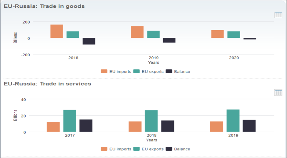 Relația comercială dintre Federația Rusă și Uniunea Europeană este, însă, de o asimetrie frapantă: Rusia este al cincilea partenere comercial al Uniunii, cu 4.8% din comerțul internațional cu bunuri al UE. Dar pentru Moscova, UE este cel mai mare partener comercial cu peste 37% din volumul comerțului exterior (36,5% din importuri și 38% din exporturi):