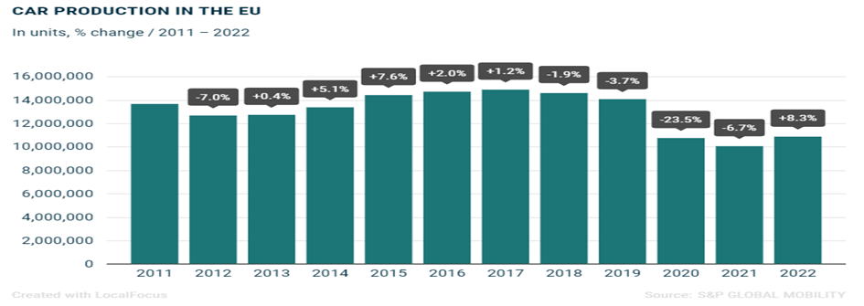Lucrurile însă nu s-au limitat doar la suprimarea lentă a siderurgiei europene, o altă importantă industrie europeană victimă a prețurilor uriașe la energie este cea auto, care a intrat într-un declin evident, de la 13,7 milioane de mașini produse în UE în 2011, ajungând la 10,9 milioane de mașini în 2022:
