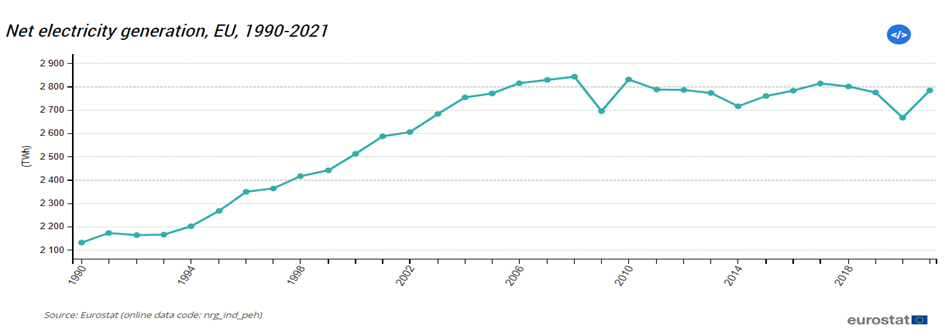 Ei bine, realitatea se încăpățânează să fie total diferită de imaginea pe care o dorește vârful Uniunii. Căci producția de electricitate nu a scăzut mai deloc din 2005 încoace, ea rămânând la un nivel de aproximativ 2780 TWh: