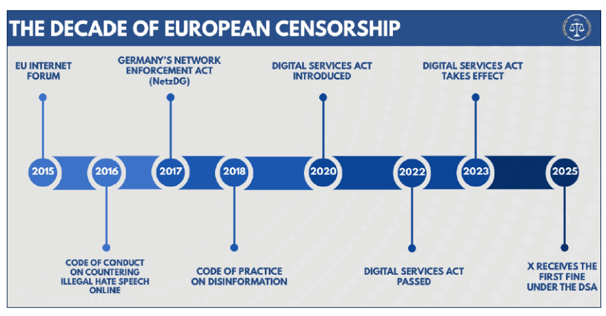 „Comisia Europeană, într-un efort vast de un deceniu, a presat cu succes platformele de social media să își schimbe regulile de moderare globală, afectând astfel direct libera exprimare a americanilor aflați în Statele Unite. Deși deseori a fost prezentată ca o combatere a așa zisului „discurs al urii” sau „dezinformării”, Comisia Europeană a lucrat să cenzureze informație adevărată și discurs politic despre cele mai importante dezbateri politice din istoria recentă: inclusiv pandemia Covid-19, migrația în masă și subiectele transgender.” (p. 2)