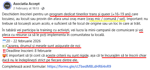 Pe data de 2 februarie 2026, Asociația de propagandă LGBTQI, Accept, publică pe pagina sa de Facebook un anunț despre o tabără pentru „tineri trans și queer” cu vârste între 16 și 19 ani (cu semnul de aproximație în fața lui 16). Erau eligibili copiii din sate sau orașe mici, sau proveniți de acolo, care s-au mutat într-un oraș mai mare. Termenul era foarte în pripă, de doar șase zile, până pe 8 februarie, pentru o tabără programată să se desfășoare între 20 și 22.