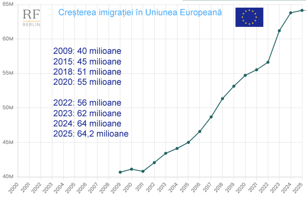 Graficul creșterii străinilor din țările UE arată o schimbare de filosofie a blocului comunitar, care a căutat și obținut asemenea schimbări demografice. E foarte important de notat acest aspect pentru că, practic, Uniunea Europeană a devenit cu totul altceva față de organizația la care România a aderat în 2007. Și cu siguranță e diferită față de cea care era în deceniul anterior, când țara noastră făcea toate sacrificiile cunoscute ca „reforme”, inclusiv prin cedarea pe sume derizorii a unor importante resurse industriale și de energie (cum ar fi Petrom sau alte privatizări).