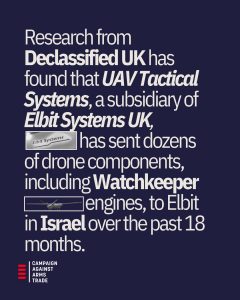 Cercetările realizate de Declassified UK arată că UAV Tactical Systems, o subsidiară a Elbit Systems UK, a trimis zeci de componente pentru drone – inclusiv motoare pentru modelul Watchkeeper – către Elbit în Israel, în ultimele 18 luni.