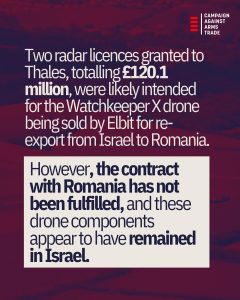 Două licențe pentru radare, acordate companiei Thales și însumând 120,1 milioane de lire sterline, au fost cel mai probabil destinate dronei Watchkeeper X, pe care Elbit o vindea pentru re-export din Israel către România. Totuși, contractul cu România nu a fost îndeplinit, iar aceste componente pentru drone par să fi rămas în Israel.