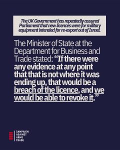 Guvernul Marii Britanii a asigurat în mod repetat Parlamentul că noile licențe vizau echipamente militare destinate re-exportului din Israel. Ministrul de Stat din Departamentul pentru Afaceri și Comerț a declarat: «Dacă ar exista dovezi, în orice moment, că echipamentele nu ajung acolo unde trebuie, aceasta ar reprezenta o încălcare a licenței, iar noi am putea să o revocăm.»