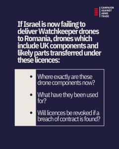 „Campania Împotriva Comerțului cu Arme” semnalează îngrijorări legate de faptul că Israelul nu a livrat României dronele Watchkeeper, deși acestea conțin componente britanice și piese transferate în baza unor licențe specifice. Situația ridică trei întrebări esențiale privind responsabilitatea și transparența: