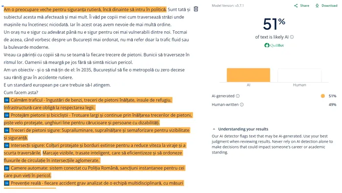 Pentru a doua postare analizată, aplicația de detectare a indicat un scor de 51%. În această postare, Cătălin Drulă abordează tema siguranței rutiere și își exprimă dorința ca, până în 2035, Bucureștiul să devină o zonă metropolitană ferită de accidentele rutiere grave.
