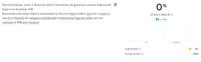 Candidata din partea AUR, Anca Alexandrescu, a vorbit în ultima postare de pe pagina de Facebook tot despre un parc, Parcul Plumbuita din sectorul 2 al Capitalei. Alexandrescu spune că Bucureștiul s-a degradat din cazua guvernării USR-ului din ultimii 4 ani. Aplicația de detectare a indicat un scor de 0% pentru postarea candidatei.