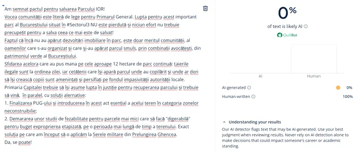 Conform celui mai recent sondaj INSCOP, Danei Băluță și Ciprian Ciucu sunt favoriți în cursa pentru Primăria Capitalei. În cazul postărilor lui Ciucu, analizate cu ajutorul aplicațiilor de detectare a Inteligenței Artificiale, rezultatul a fost de 0%. În postarea de ieri, candidatul vorbește despre lupta pe care o duce pentru recuperarea și salvarea Parcului IOR.