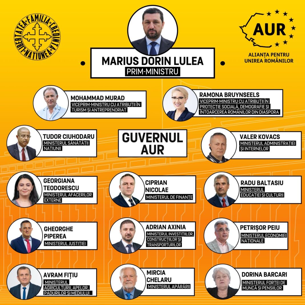 Pe lista de miniștri propuși de președintele AUR, George Simion, se află fosta șefă a Casei de Pensii, Dorina Barcari, care va prelua în viitoarea guvernare AUR Ministerul Forței de Muncă și Pensiilor. Pentru portofoliul Ministerului Economiei Naționale, AUR îl propune pe profesorul Petrișor Peiu. La conducerea Ministerului Administrației și Internelor, George Simion îl propune pe Valer Kovacs, polițistul timișorean dat afară din sistem în mod abuziv. La Ministerul Justiției propunerea făcută de AUR este avocatul Gheorghe Piperea. Omul de afaceri Mohammad Murad va prelua în guvernarea AUR portofoliul de vicepremier cu atribuții în domeniul turismului și antreprenoriatului.