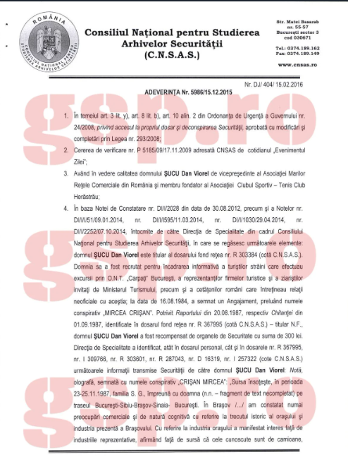 - “Colaborarea cu Securitatea a domnului Șucu Dan Viorel, desfășurată sub numele «Crișan Mircea», în perioada 1984-1989, a avut la bază angajamentul de colaborare, neluat prin constrângere, ci liber asumat”