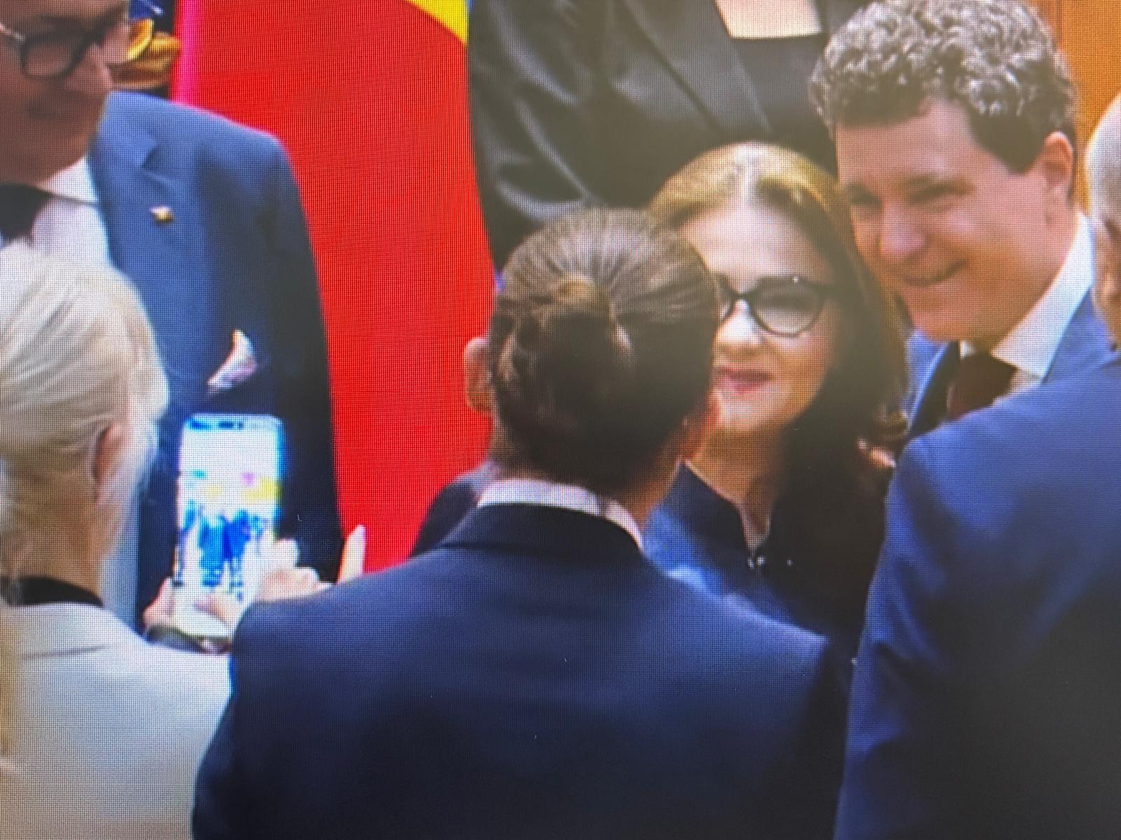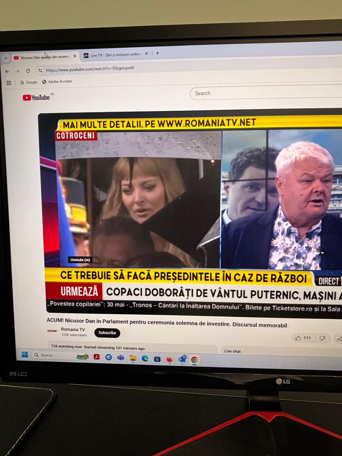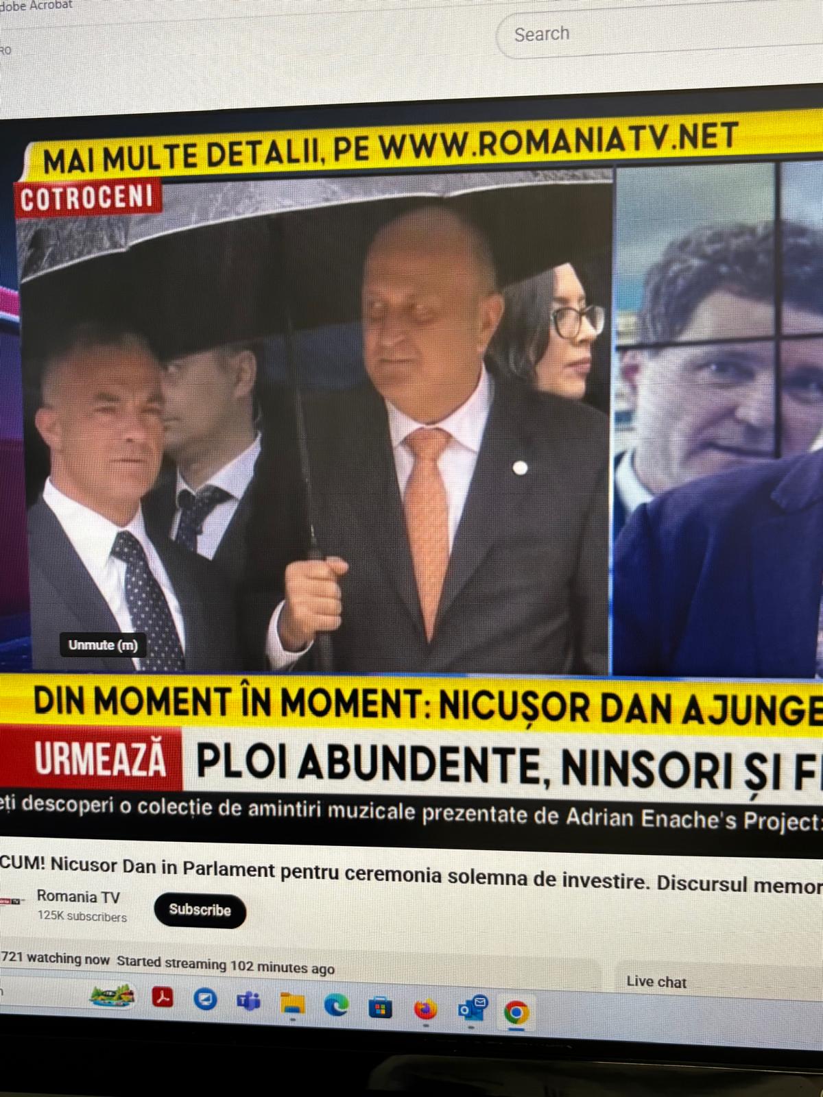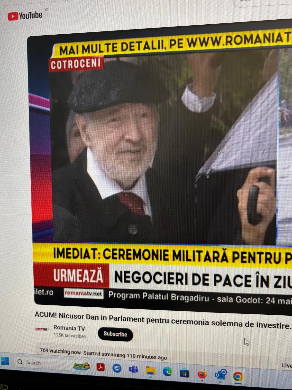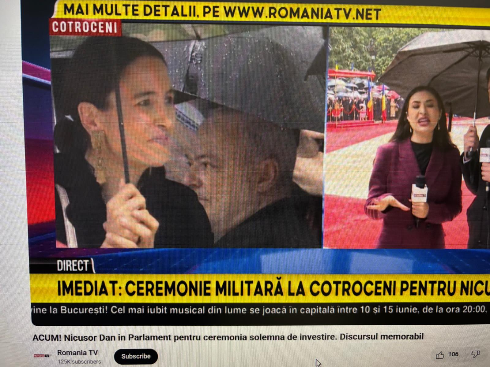 Într-o primă imagine , o puteți vedea pe Cristina Trăilă, Secretarul General al Guvernului, un om al lui Coldea, prima la post, alături de Nicușor Dan, soția celebrului Trăilă, avocatul lui Coldea și-al lui Dumbravă. Într-o a doua poză, puteți să-l vedeți pe celebrul LuCovid Orban, bineînțeles, premierul buclucaș, în primul rând al prezentării de la Cotroceni, tot om al Statului Paralel, direcționat și manipulat de către Coldea, cu tatăl fost colonel de Securitate, de origine maghiară, înainte de 1989. O altă celebritate este Dan Șucu, omul de afaceri dovedit informator al Securității, care se și pregătește să-i ia locul lui Nicușor Dan. Ni s-a spus despre el, din partea unui colaborator istoric, că nu doar că a fost informator al Securității, a fost un ofițer de Securitate la CIE, Centrala de Informații Externe, coleg cu Viorel Cataramă. Stelian Tănase, celebrul oportunist post-decembrist, care atunci când se schimbă regimul înspre o zonă controlată de către Statul Paralel, brusc reapare la rampă; era și astăzi, nu știu cât are, 70-80 de ani, nu mai știu cât are Stelian Tănase, în curtea Palatului Cotroceni, și cred că mai apare un om de afaceri. Este și Clotilde Armand, bineînțeles, cu umbrela în primul rând; și ea ar dori să meargă la Primăria Generală, dacă s-ar putea, dacă nu, măcar consider prezidențial, să fie pe acolo ceva. În fine, încă un om de afaceri dintr-o rețea de afaceri bucureșteană. O avem și pe însăși Delia, da, da, cântăreața Delia, despre ea este vorba, cea care are o opinie politică foarte bine consolidată, la fel ca și Andreea Raicu, care, de asemenea, se distinge nu prin alte lucruri, nu vă gândiți la prostii, ci prin marea expertiză politică, doar și-a exersat-o atunci când a spus că ea vrea în viitor banană. În regimul Nicușor Dan, vrea blugi rupți și banană. A fost și ea acolo. Ăsta e regimul!