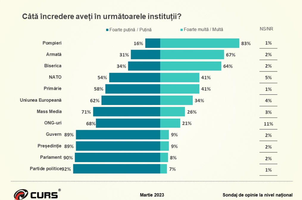 În rest, clasamentul, știți cine-i pe primul loc? Pompierii! Bună șmecheria, nu? Pe locul doi, armata, pe care nu prea o avem și pe locul trei, decăzută bine, este Biserica Ortodoxă. dacă Patriarhul nostru mai face temenele de multe ori în fața cuiva, ca ambasadoarea Statelor Unite la București, apoi atunci cred că încrederea în biserică se va duce și mai jos.