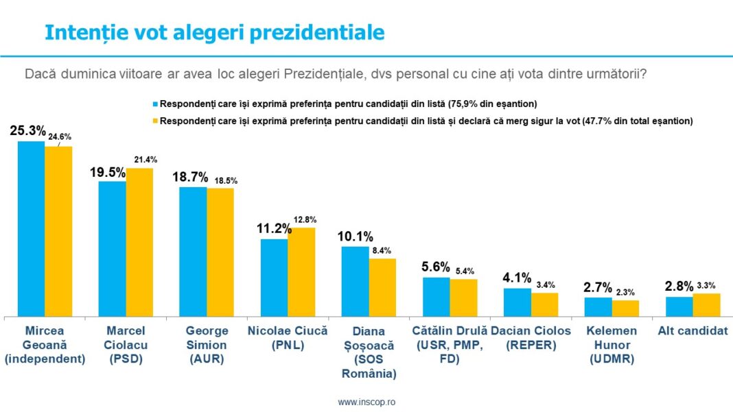 Comentarii: Scorul lui Geoană, în primul rând, mi se pare total fals, dar total fals; dacă ar fi așa, prieteni, deja acest lucru s-ar sesiza pe străzi, ar fi o emulație pro-Geoană sau ar fi perceput din audiența emisiunilor radio-tv, unde ar fi prezent Mircea Geoană, ori nu e cazul. Cei de la INSCOP, însă, s-au acoperit în cazul lui Geoană aplicându-i eticheta de independent, care, vezi, Doamne, l-ar motoriza pe soțul Mihaelei. Ciolacu e mult sub scorul PSD, iar Simion ar egala procentul AUR din sondaje. Ciucă reflectă probabil scorul real al PNL, pentru că de unul singur ar fi pe la 2-3%, treabă valabilă și în cazul lui Drulă de la USR. Procentajul lui Șoșoacă indică potențialul bazinului suveranist, e un scor suplimentar cu cel al AUR; dintre toți candidații măsurați doar Șoșoacă a declarat că va candida, nota bene. Scorurile a două personalități despre care se discută că vor intra în cursă, Eduard Hellvig și Laura Kovesi, n-au fost raportate, că de măsurat vă asigur că s-au măsurat.