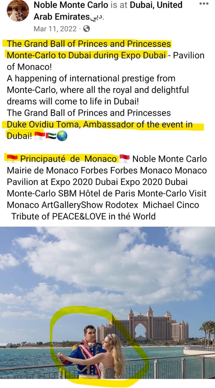 Ovidiu Toma a investit mulți bani pentru a fi numit “Duke Ovidiu” de Monte Carlo și pentru a avea acces la diverse evenimente frecventate de oameni cu foarte mulți bani și influență, mai ales în Monte Carlo și Elveția. Totul pentru a promova “Proiectul”…