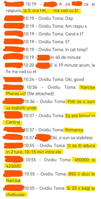 Undeva în China, Ovidiu Toma a avut nevoie de niște “favoruri”, mai exact ca cineva să livreze CASH o sumă mare de bani (850.000 HKD, adică 110.000 dolari americani), trimisă de Ovidiu Toma în bitcoin, către altcineva. Banii au fost retrași de intermediar în două tranșe și livrați printr-o altă persoană la destinatar.