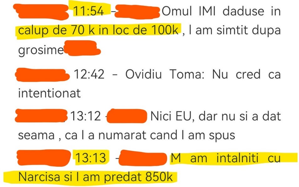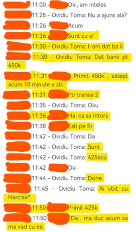 Undeva în China, Ovidiu Toma a avut nevoie de niște „favoruri”, mai exact ca cineva să livreze CASH o sumă mare de bani (850.000 HKD, adică 110.000 dolari americani), trimisă de Ovidiu Toma în bitcoin, către altcineva. Banii au fost retrași de intermediar în două tranșe și livrați printr-o altă persoană la destinatar.