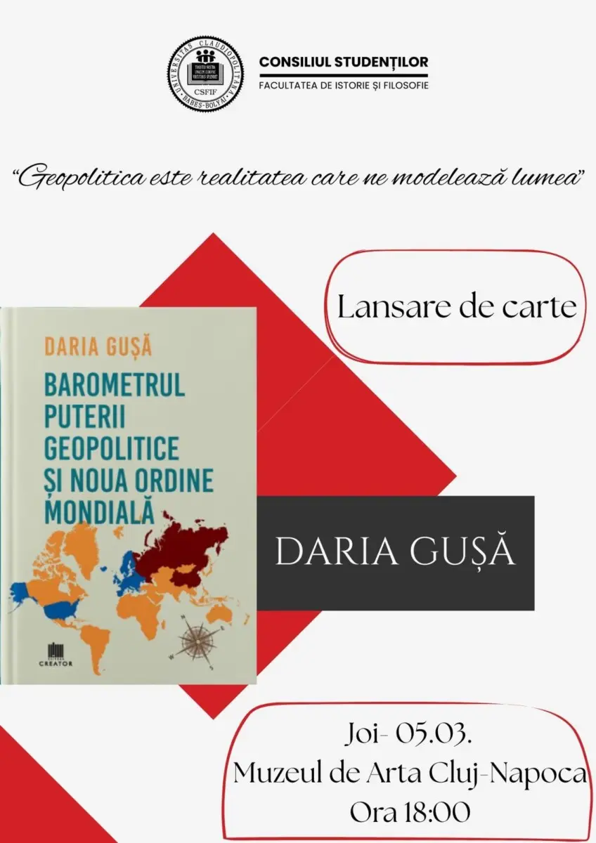 Cluj-Napoca găzduiește joi, 5 martie, de la ora 18:00, la Muzeul de Artă, lansarea volumului „Barometrul puterii geopolitice și noua ordine mondială”, semnat de Daria Gușă. Evenimentul este organizat de Consiliul Studenților din cadrul Facultății de Istorie și Filosofie.