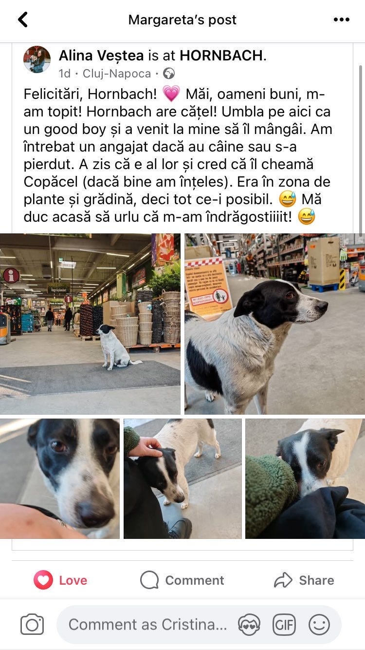 Am doi câini maidanezi și două pisici maidaneze, inima mea vibrează mereu la genul acesta de întâmplări. Bravo, Hornbach, fă așa în fiecare unitate și dă o lecție și restului României: