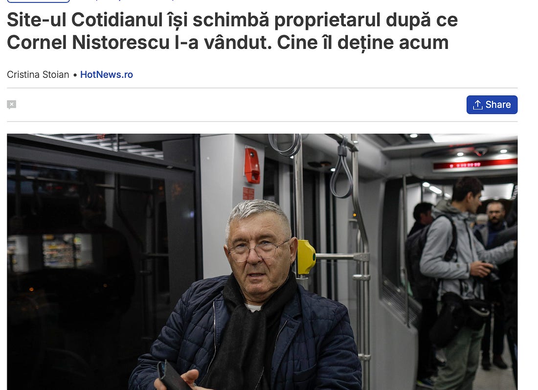 Site-ul Cotidianul.ro, deţinut de Cornel Nistorescu, îşi schimbă proprietarul după 15 ani. Publicaţia online trece în portofoliul grupului Clever EAD, care deține și platformele PrimaNews.ro și Profit.ro, potrivit Pagina de Media. Achiziția a fost confirmată de Orlando Nicoară.