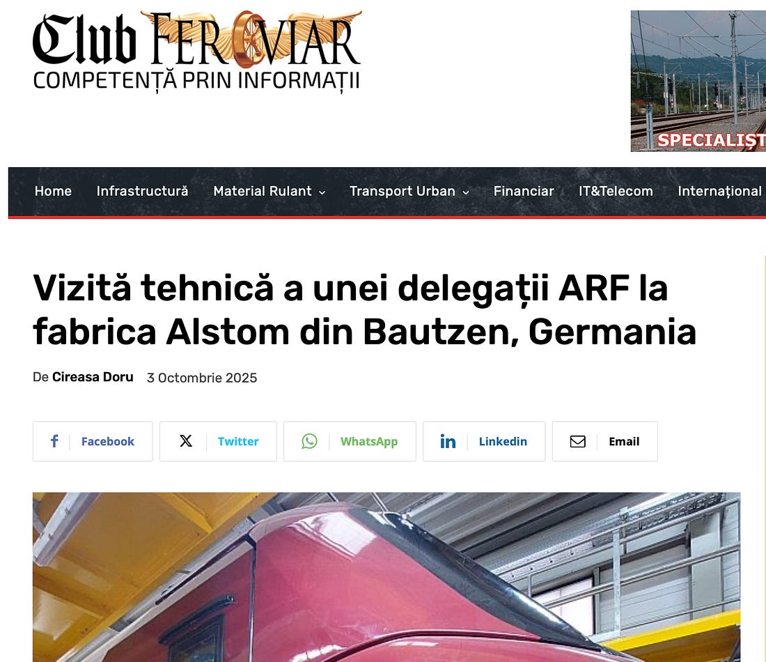 În perioada 30 septembrie – 02 octombrie 2025, o delegație a ARF, condusă de Mihai Barbu, președintele Autorității pentru Reformă Feroviară, a efectuat o vizită tehnică la fabrica de material rulant Alstom din localitatea Bautzen, Germania.