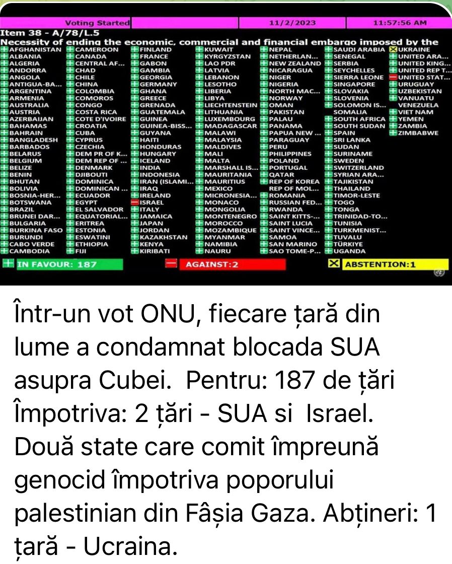 De vreo 25 de ani ONU supune la vot rezoluția referitoare la încetarea embargoului impus de către SUA asupra Cubei, dar americanii și aliații lor s-au opus în mod constant, SUA s-au abținut o singură dată în 2016, când Obama a încercat o operațiune de apropiere prin seducție de regimul de la Havana. Cuba este un vecin al Americii, o țară frumoasă, dar chinuită, cu oameni pauperizați și orașe devastate de sărăcie, așa cum a relatat recent la GOLD FM și SRS aflat în vizită acolo. Votul ONU are o componentă geopolitică certă, dar el este orientat în primul rând în scop umanitar, majoritatea cubanezilor fiind în situația să moară de foame la propriu. Vineri, acest vot devenit tradițional pentru încetarea embargoului a fost reluat, iar rezultatul a fost 187 de voturi pentru, două voturi împotrivă (SUA și Israel), respectiv o abținere (Ucraina). E limpede deci că lumea s-a întors contra Americii, iar votul de la ONU referitor la embargou, ce vine după cel ultramajoritar pentru armistițiu umanitar în Gaza de-acum o săptămână, tot împotriva SUA și Israel, are rolul de a indica SUA că e obligată să-și revizuiască rapid politica externă. Desigur că votul nu are caracter executoriu, dar pune un fundament diplomatic pentru presiunile ce se vor executa contra SUA în perioada următoare cel puțin pe trei aliniamente, care sunt Israel-Palestina, China-Taiwan, respectiv Rusia-Ucraina.